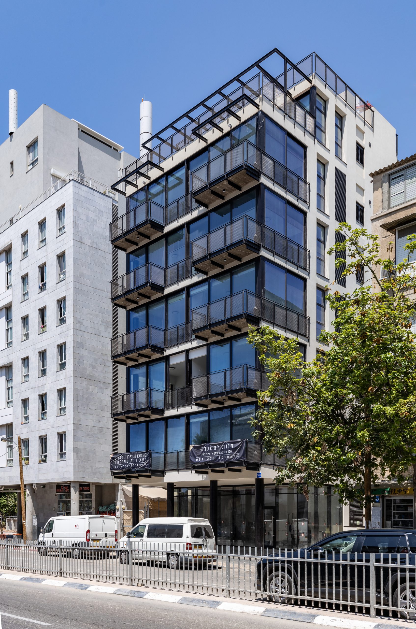 סלונים מוארים עם ויטרינות ענקיות ונוף עירוני תל־אביבי אמיתי.